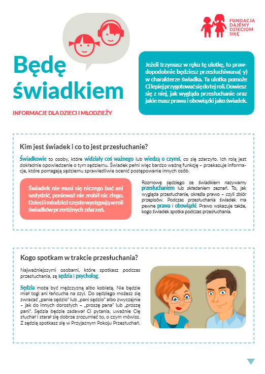 Ulotka zawierająca podstawowe informacje na temat przesłuchania dzieci i młodzieży w Przyjaznym Pokoju Przesłuchań.