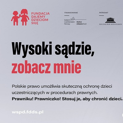 - kampanię „Wysoki Sądzie, zobacz mnie”, której celem jest wsparcie sędziów, prokuratorów, kuratorów procesowych i wszystkich osób, od których zależy los dzieci stających przed wymiarem sprawiedliwości - chcemy przypominać profesjonalistom, jak wiele zależy od nich oraz że zawsze znajdą merytoryczne wsparcie w naszej Fundacji