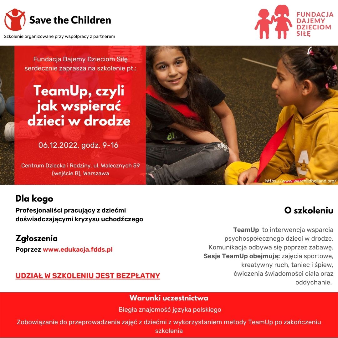 Serdecznie zapraszamy do udziału w szkoleniu przygotowującym do prowadzenia zajęć z dziećmi w drodze (dziećmi w kryzysie uchodźczym) metodą TeamUp, będących elementem wsparcia psychospołecznego.
